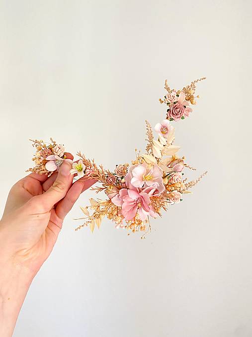Aplikácia je vyrobená z textilných/aranžérskych kvetov, lístkov, trávy, drôtiku, floristickej pásky a iných drobností určených k aranžovaniu. Tvaruje sa, do vlasov za zapína po stranách cez očká klasickými sponkami :) Aplikáciu môžete nosiť samostatne, môžete si k nej zakúpiť však aj kvetinový závoj na klipoch. Set obsahuje 5 klipov...